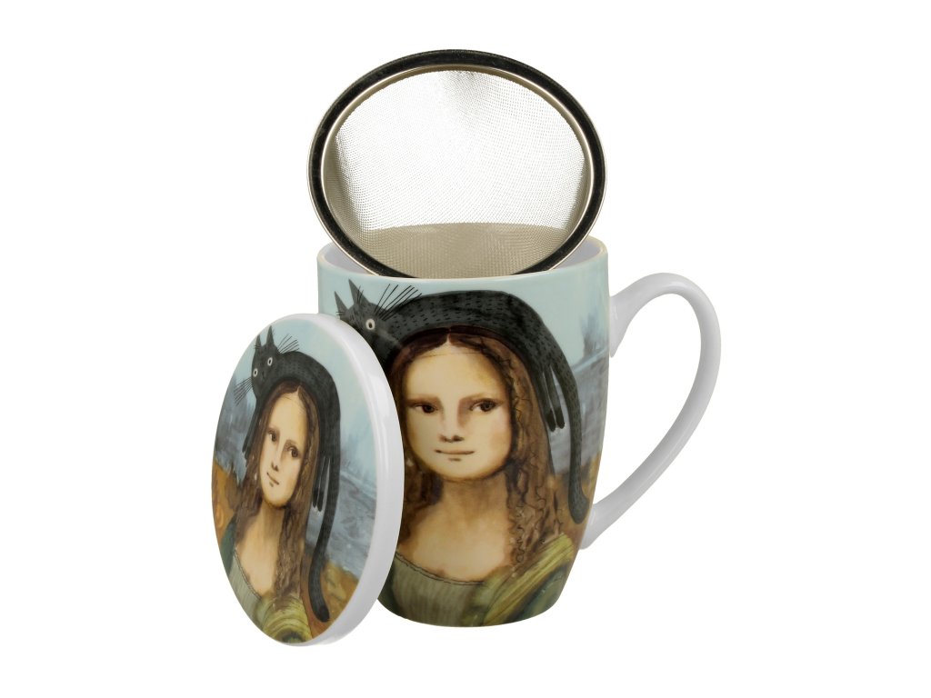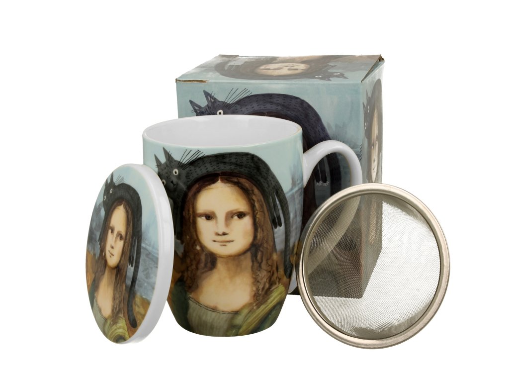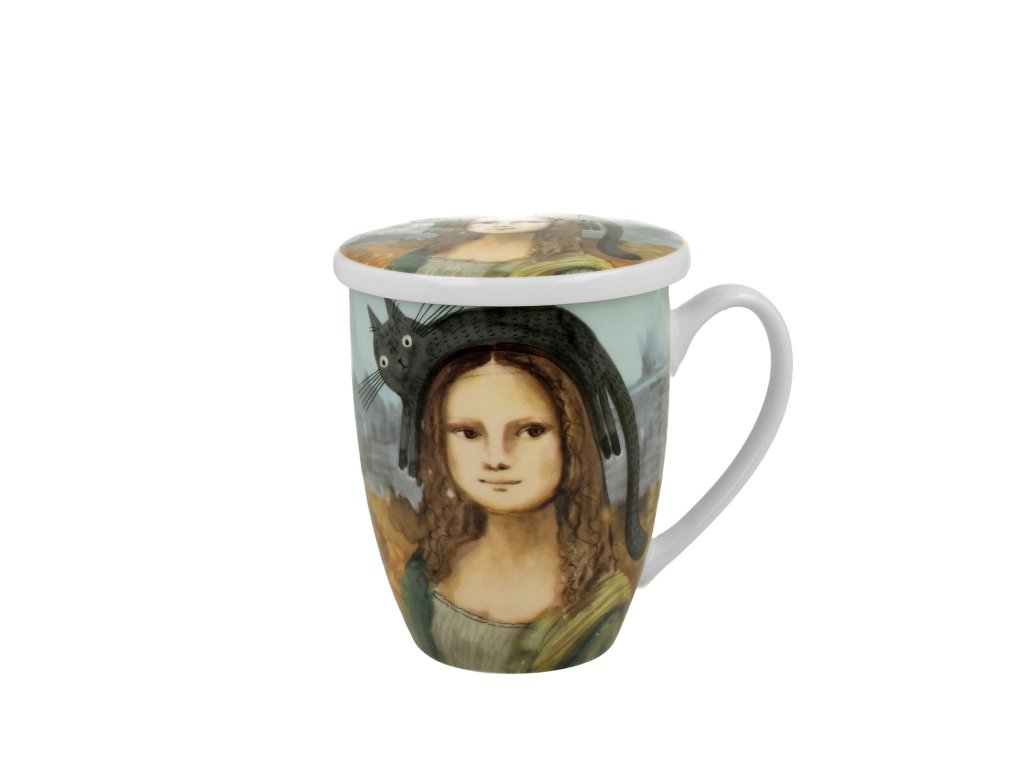 DP - Porcelánový hrnek se sítkem a víčkem Mona Lisa s kočkou - 360 ml