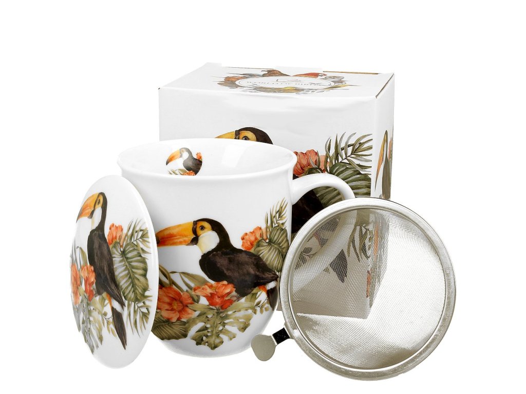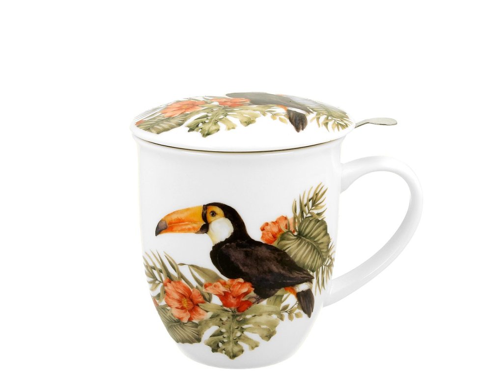 Velký hrnek na bylinky s jemným sítkem a porcelánovám víčkem s dekorací z kolekce "The World of Birds" polského producenta Duo gift. Vhodné do myčky na nádobí i mikrovlnné trouby.