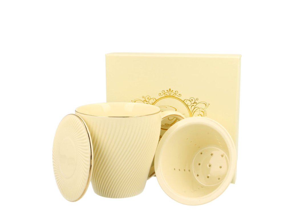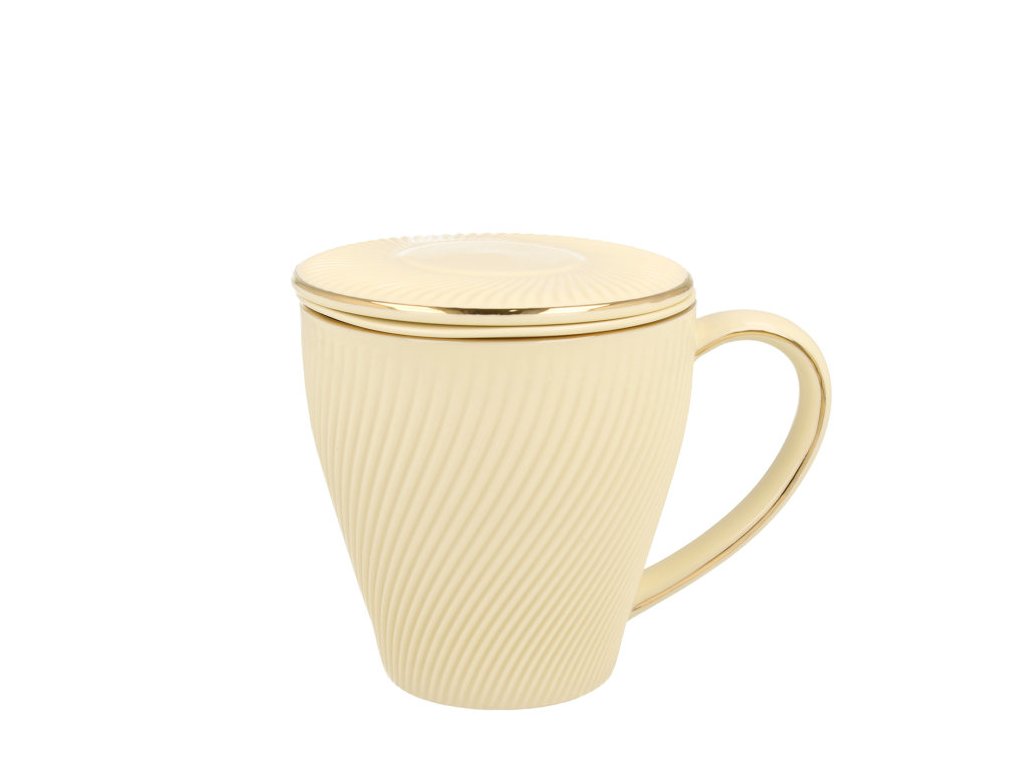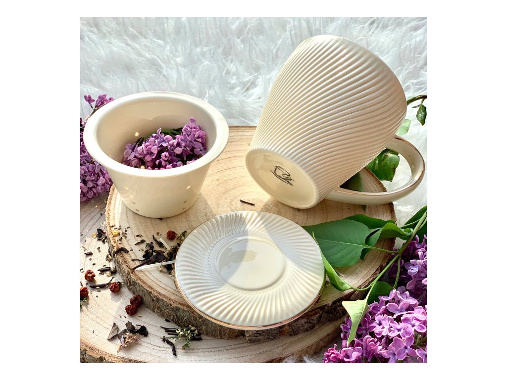 Jemný porcelán krémové barvy dekorovaný zlatou linkou. Nevhodné do myčky ani do mikrovlnky.