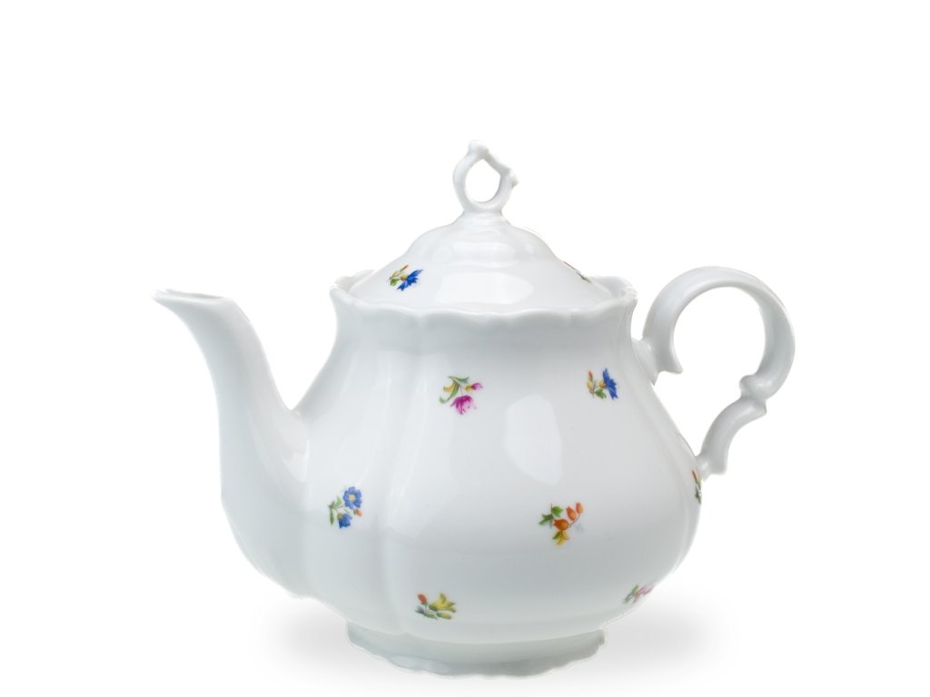 Oblíbený dekor drobných poházených kytiček - neboli házenky - na porcelánové konvici tvaru Verona vyrobené v karlovarské porcelánce G.Benedikt 1882. Lze použít v mikrovlnné troubě i myčce na nádobí.