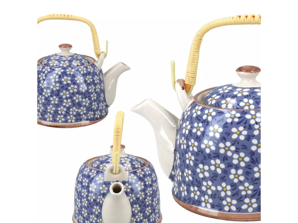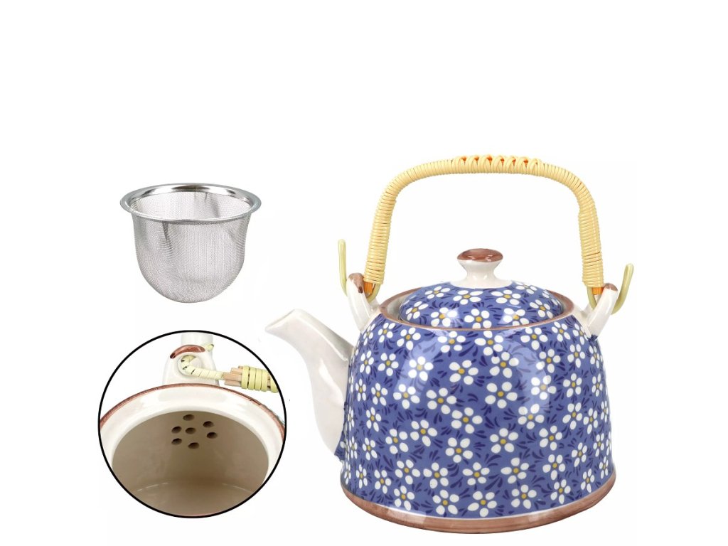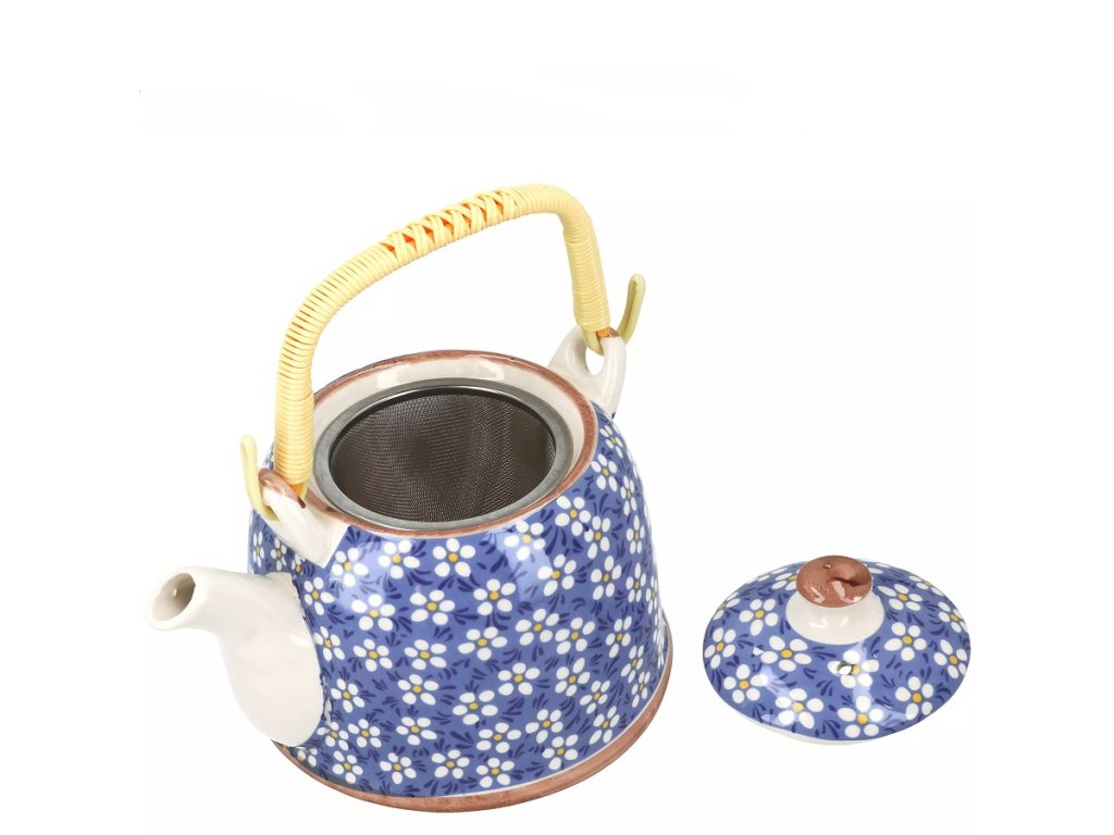 Konvice na čaj 900 ml se sítkem a proutěným uchem - květinky na modrém podkladu