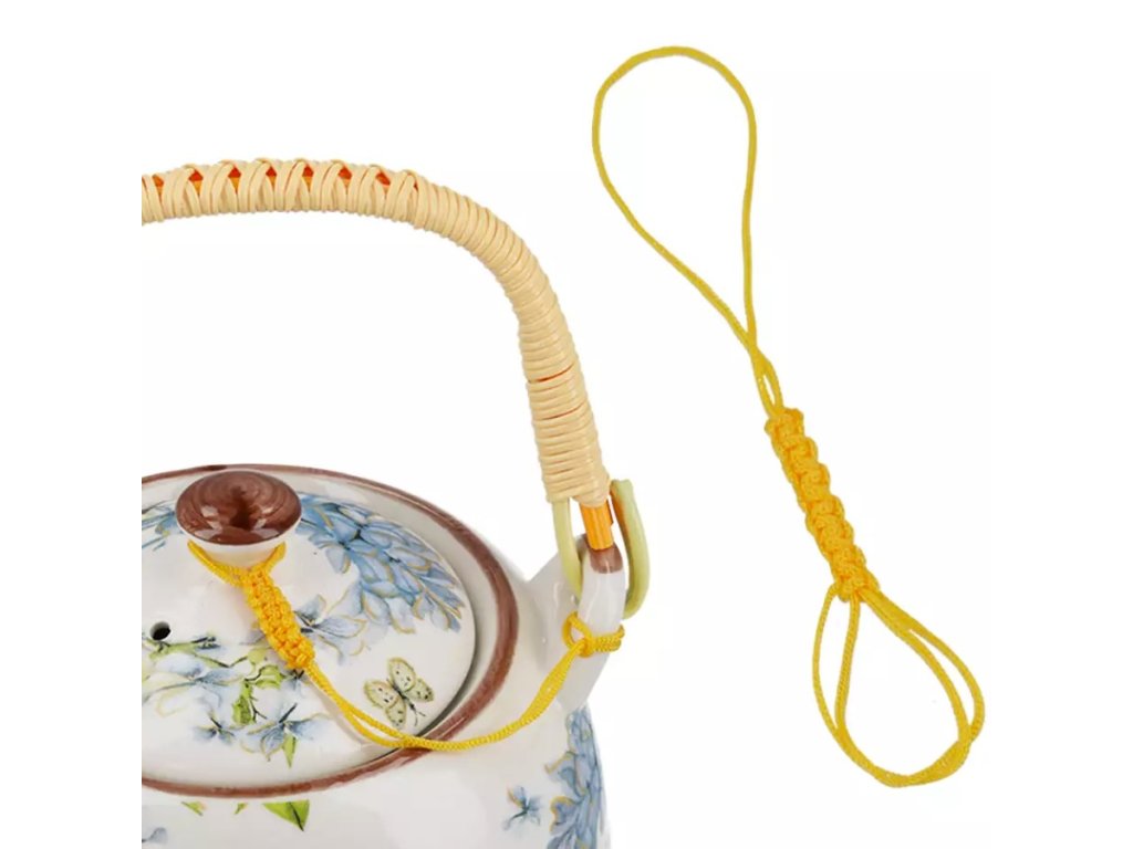 Keramická konvička na čaj s kovovým sítkem a lýkovou úchytkou.