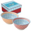 Sada dvou keramických misek Geometric v modré, oranžové a červené barvě, o průměru 15 cm. Dárková krabička obsahuje dva kusy misek.
