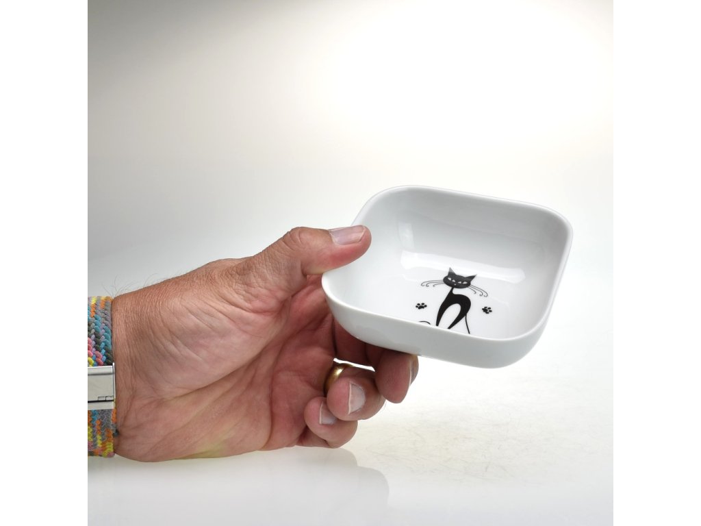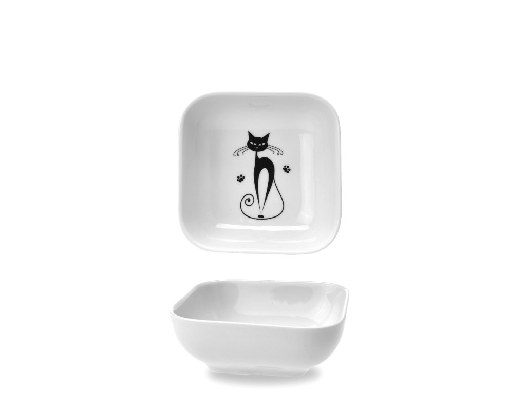Drobná čtvercová mistiška na omáčky, máslo, nebo džem. Misky jsou nadekorované šesti různými dekory černých koček viz obrázek. Vhodné do myčky na nádobí i mikrovlnné trouby.