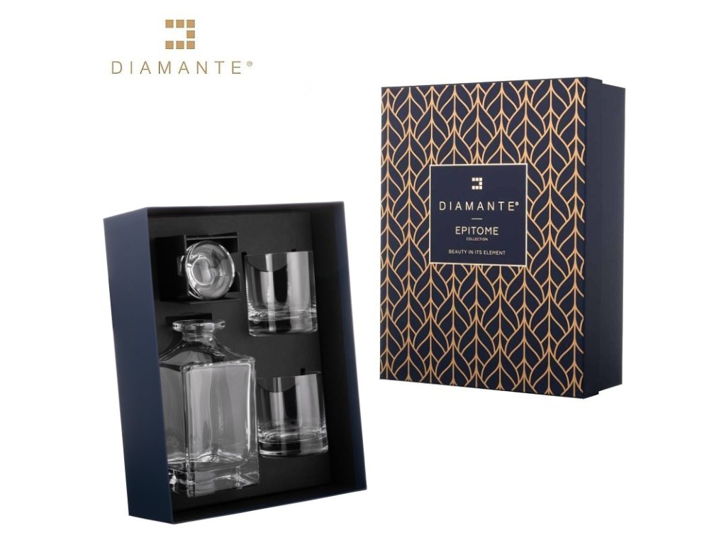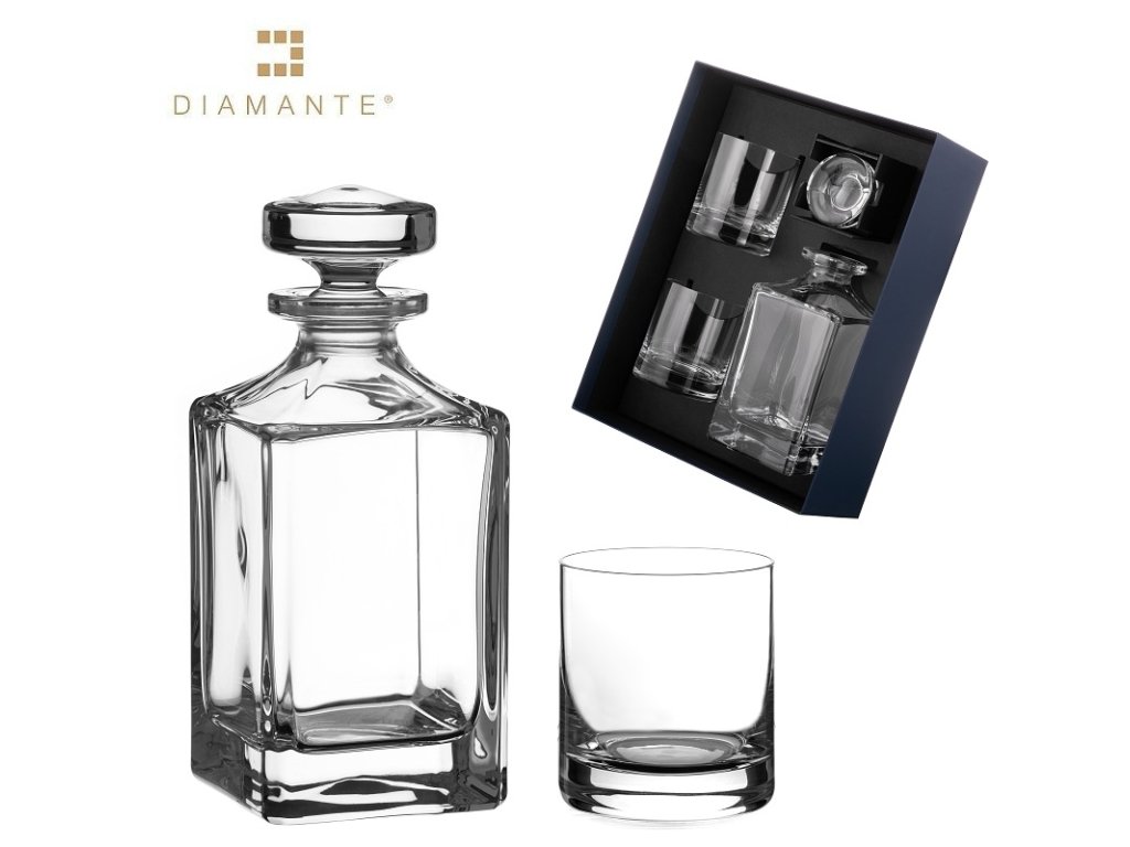 Křišťálový whisky set pro dvě osoby v exklusivním dárkovém balení - skvělý dárek především pro muže. Reprezentativní dárkové balení v luxusní krabici s víkem s logem výrobce Diamante®. Lze použít v myčce na nádobí.