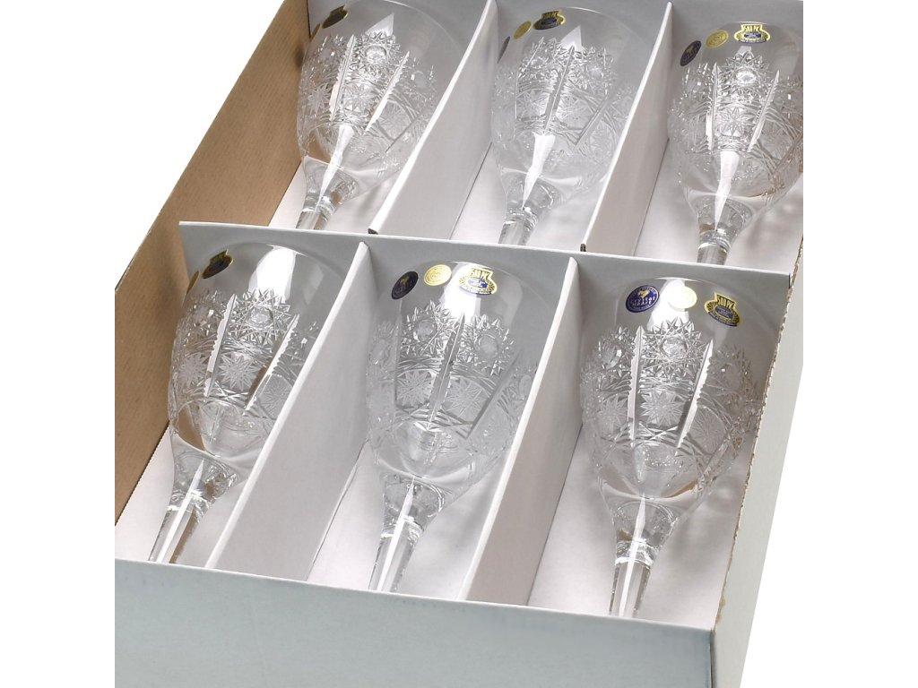 Kalíšky na víno s bohatou ruční dekorací na českém křišťálu. vysoká umělecká hodnota tradiční řemeslo reprezentativní český dárek O vzniku typu brusu 500 PK: V roce 1929 vznikl patrně nejslavnější a komerčně nejúspěšnější typ brusu českého broušeného skla, užívaného později zejména při zdobení olovnatého křišťálu, a to vzor 500 PK. Jeho autorem byl brusič a podnikatel Ladislav Prostředník z Dobrušky (zkratka PK v typu dekoru odkazuje na jméno Prostředník). Lze použít v myčce na nádobí.