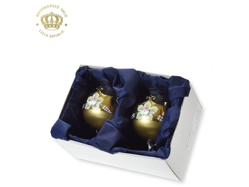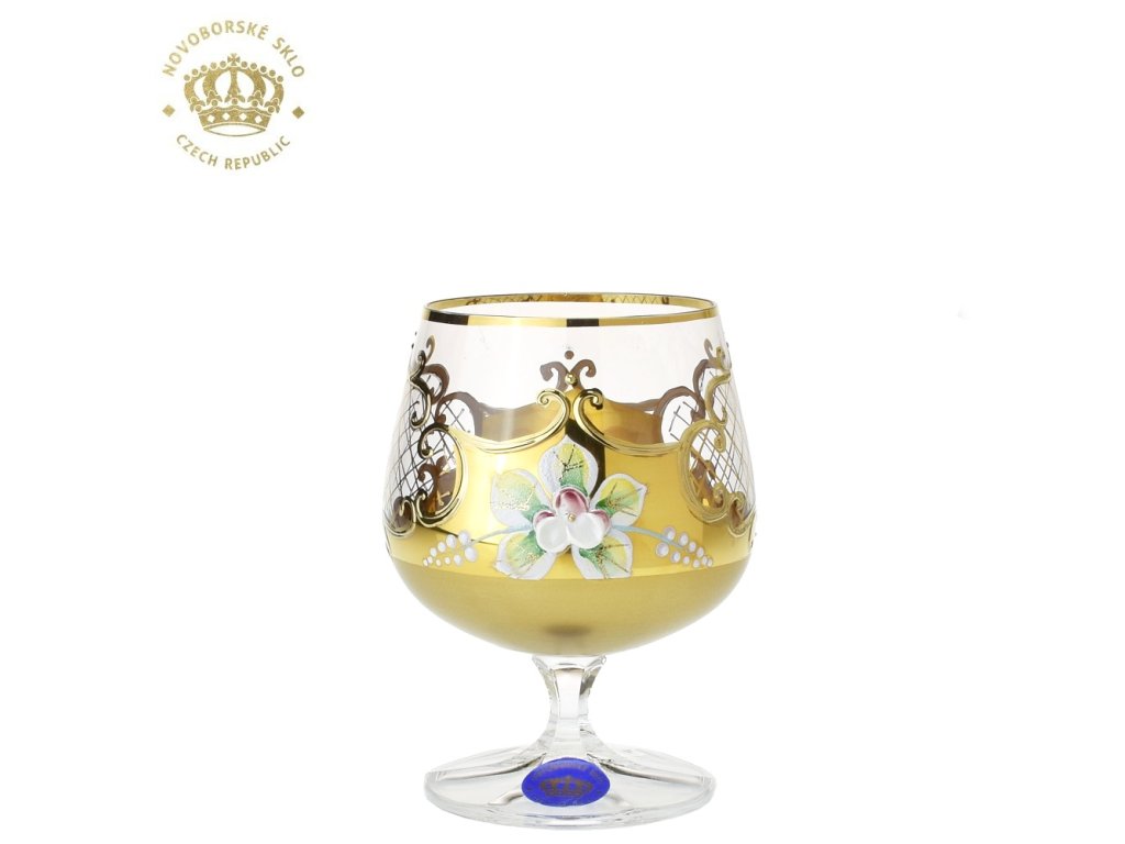 Luxusní bohatě ručně dekorovaná souprava kalíšků na brandy, nebo kvalitní rumy. Tradiční dekorace ruční malbou zlatem, ozdobeno kytičkami z vysokého smaltu. Drobné nedokonalosti a nerovnosti ve zlatých linkách na výrobku nejsou na závadu, naopak svědčí o náročné ruční dekoraci. Nelze použít v myčce na nádobí a ani mikrovlnné troubě.