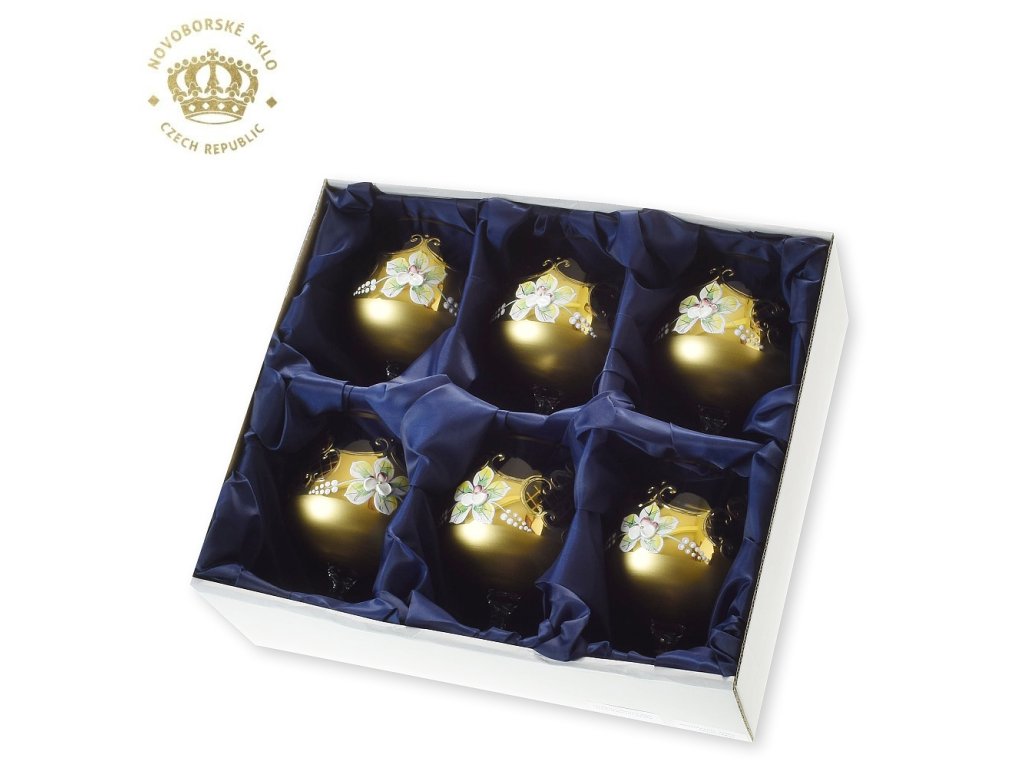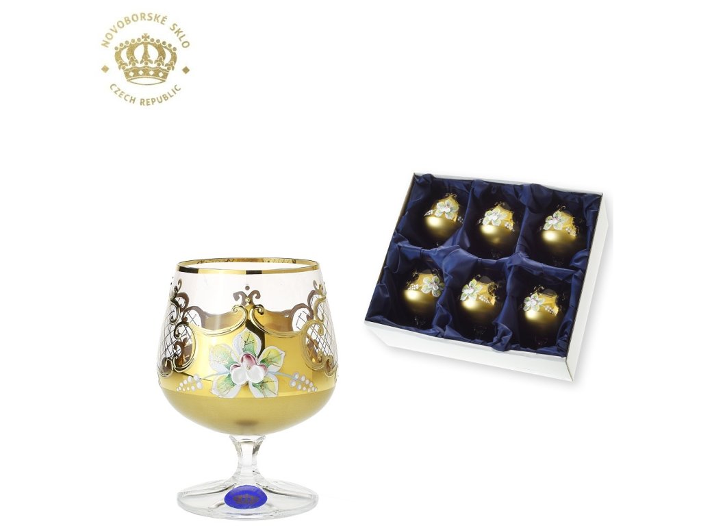 Luxusní bohatě ručně dekorovaná souprava kalíšků na brandy, nebo kvalitní rumy. Tradiční dekorace ruční malbou zlatem, ozdobeno kytičkami z vysokého smaltu. Drobné nedokonalosti a nerovnosti ve zlatých linkách na výrobku nejsou na závadu, naopak svědčí o náročné ruční dekoraci. Nelze použít v myčce na nádobí a ani mikrovlnné troubě.