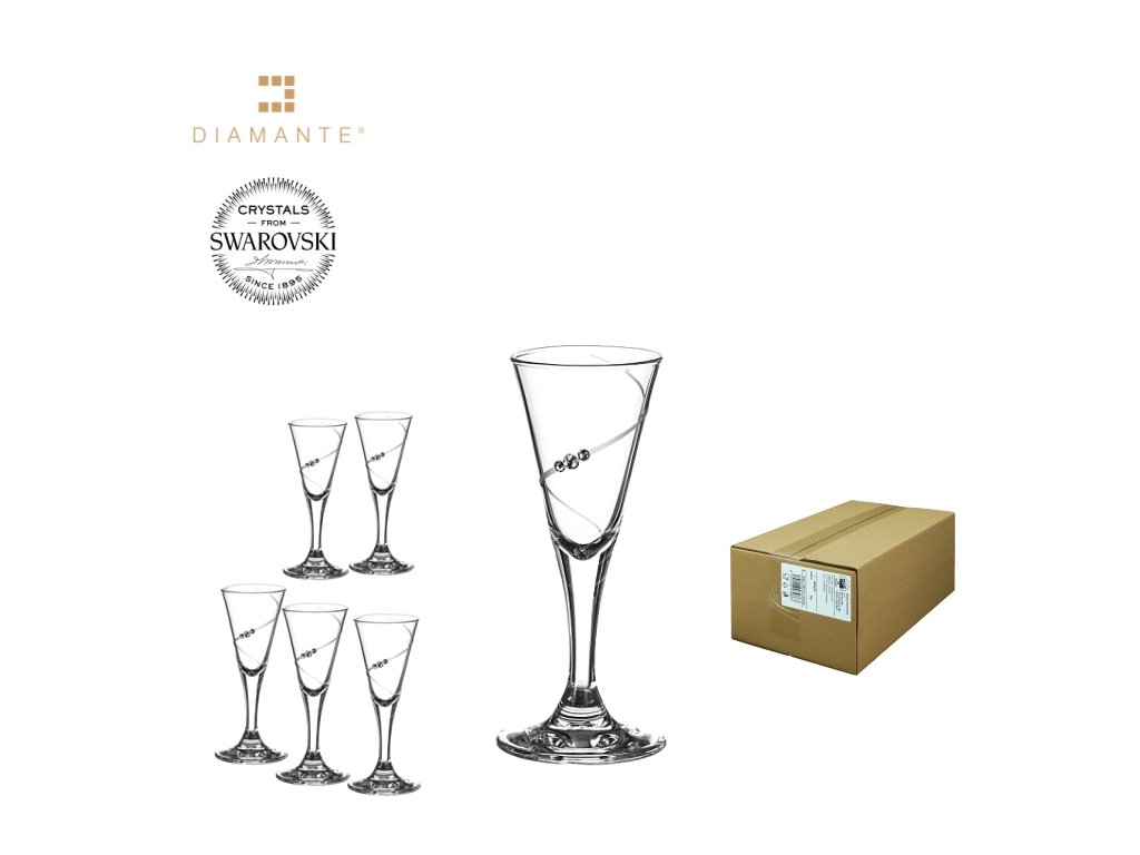 Elegantní skleničky na pálenku značky Diamante® dekorované linkou a křišťály Swarovski elements. Zabaleno v obyčejném průmyslovém kartonku. Silhouette = silueta, základní jednoduchý brus. Není vhodné do myčky nádobí.