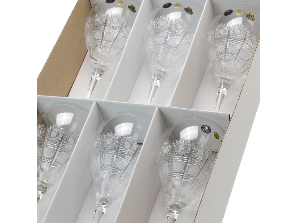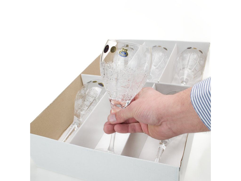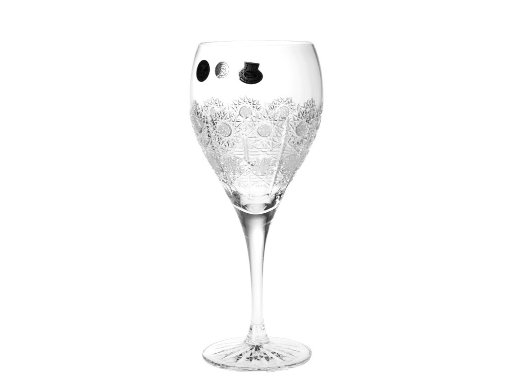 Luxusní ručně vyrobené sklenice na víno s tradičním ručním brusem typu 500PK. vysoká umělecká hodnota tradiční řemeslo reprezentativní český dárek O vzniku typu brusu 500 PK: V roce 1929 vznikl patrně nejslavnější a komerčně nejúspěšnější typ brusu českého broušeného skla, užívaného později zejména při zdobení olovnatého křišťálu, a to vzor 500 PK. Jeho autorem byl brusič a podnikatel Ladislav Prostředník z Dobrušky (zkratka PK v typu dekoru odkazuje na jméno Prostředník). Lze použít v myčce na nádobí.