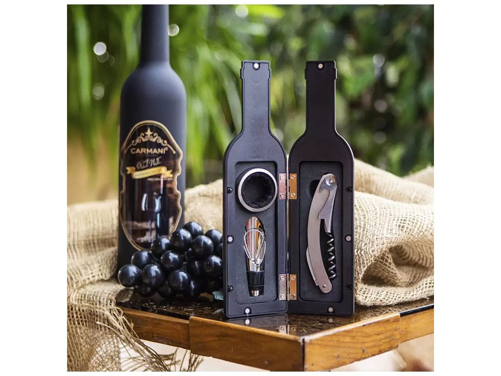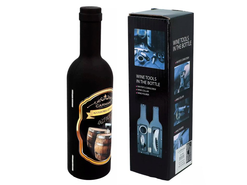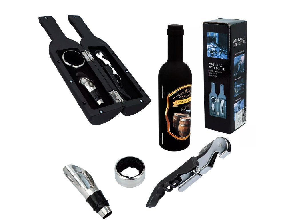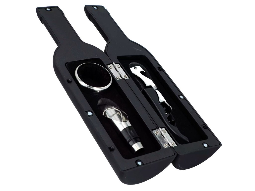 Luxusní dárek pro přátele či firemní zákazníky. Souprava nástrojů pro servírování vína v plastovém dárkovém obalu ve tvaru láhve.