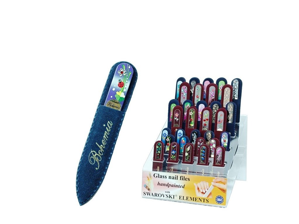 Pilník je vyroben z plochého skla (float). Povrch skleněného pilníku je jemně a rovnoměrně zdrsněný tím pádem je broušení účinné a současně i příjemné na dotek. Díky jemnosti brusné plochy skleněný pilník nehty vyhladí a tak zdárně působí proti lámání a štěpení nehtů. Na každé straně je jiná hrubost brusné plochy. Po použití můžete pilník jednoduše umýt pod tekoucí vodou. Pilníček můžete používat na přírodní nebo umělé nehty, ale taky ho můžete použít na odstraňování ztvrdlé kůže na rukách a patách. Vyberte si ten správný dekor, který bude lahodit vašemu oku. Díky ruční výrobě, tak získáte originální skvost dekorován ruční malbou, zdoben křišťály Swarovski.