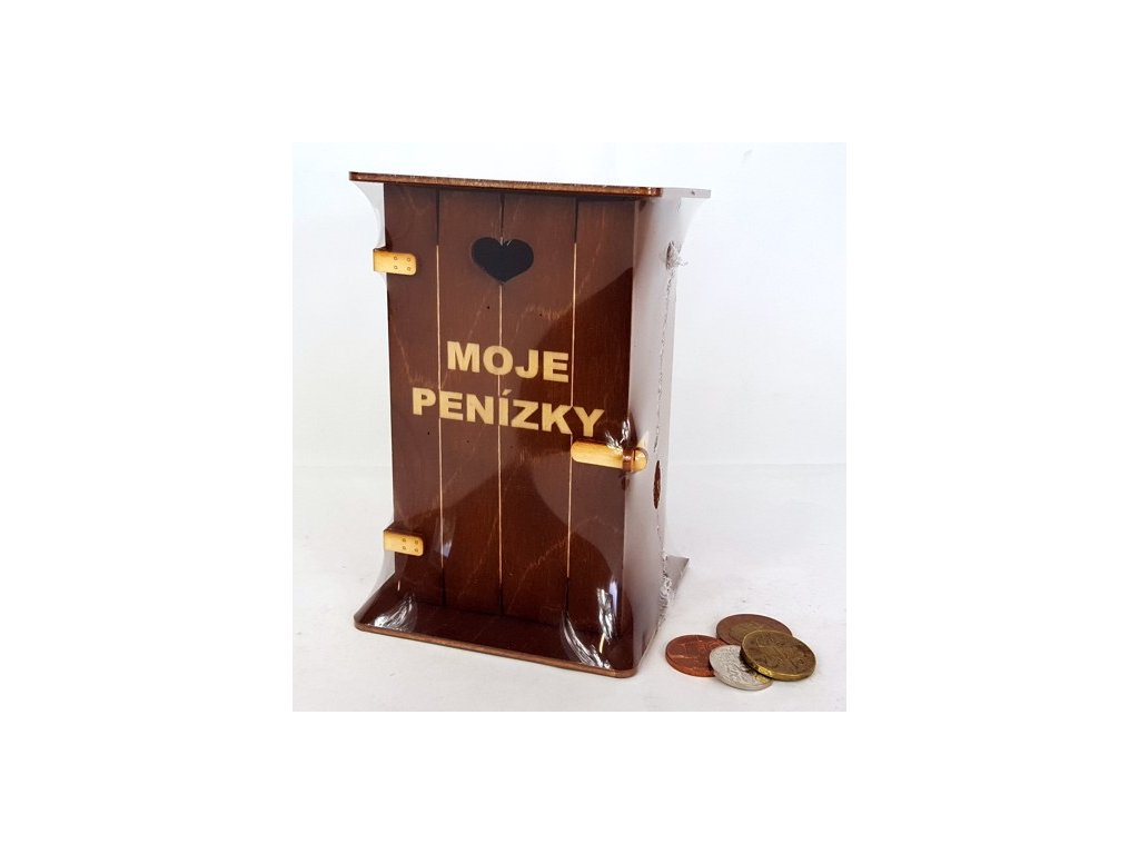 Vtipná dřevěná pokladnička ve tvru kadibudky s nápisem, z vrchu otvor na mince, ze spodu možno vylomit nařízlý otvor, rozměr: 11 x 9 x 17cm