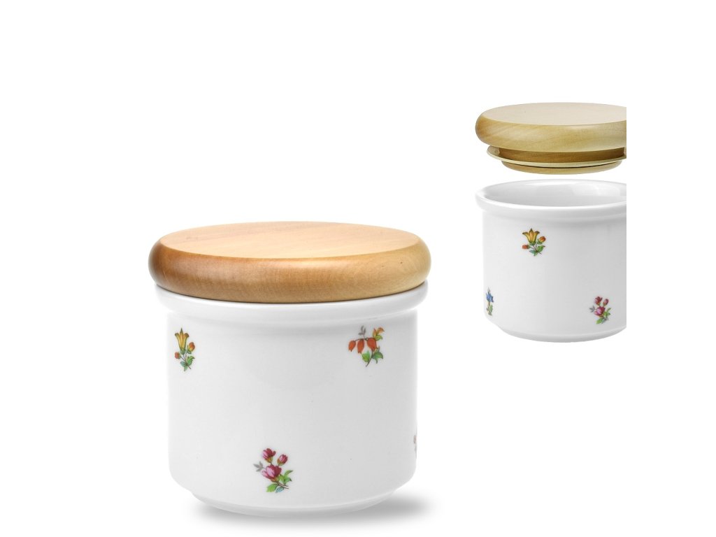 Praktická dóza se dřevěným víčkem, které má gumové těsnění, aby obsah nezvětrával (například káva, čaje, šípky apod.). Vyrábí se ve třech rozměrech. Porcelánové tělo lze použít v myčce na nádobí i mikrovlnné troubě.
