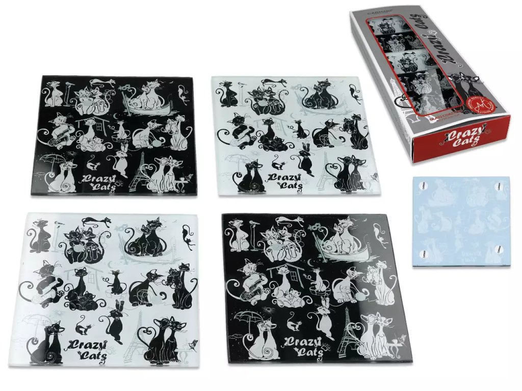 Carmani - Sada 4 skleněných tácků pod skleničky, Kočky v dárkovém balení - 4*10,5*10,5 cm