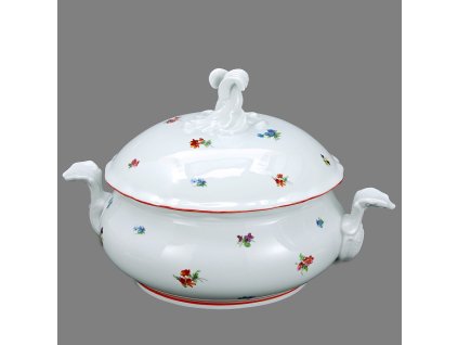 Drobné poházené (proto "házenka") květinky na tradičním tvaru Rokoko z dubské porcelánky. Tato řada je opatřena ručně malovanou červenou linkou.