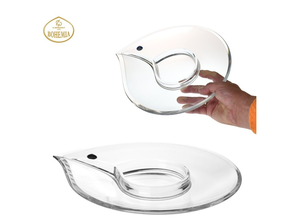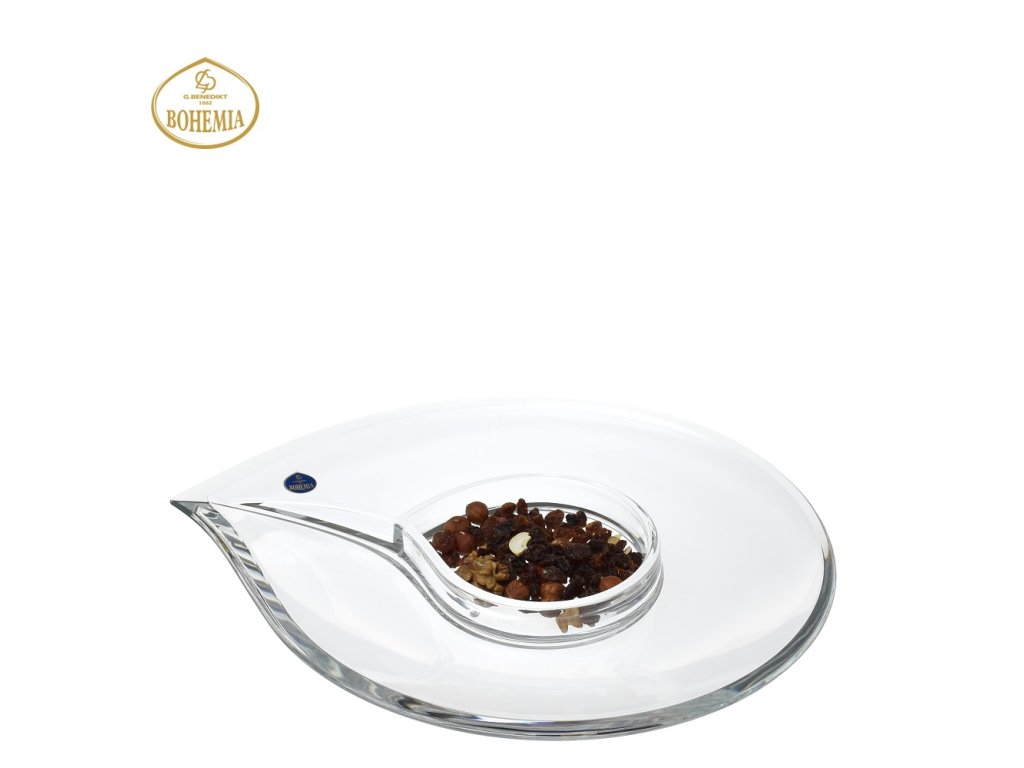 Podnos z hladkého českého křišťálu s integrovanou miskou pro pochutiny. Krásný kus skla na stůl do vašeho interiéru.