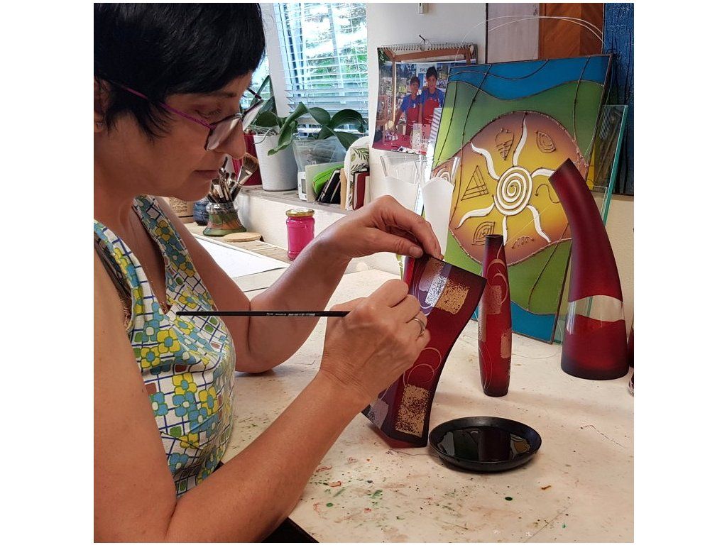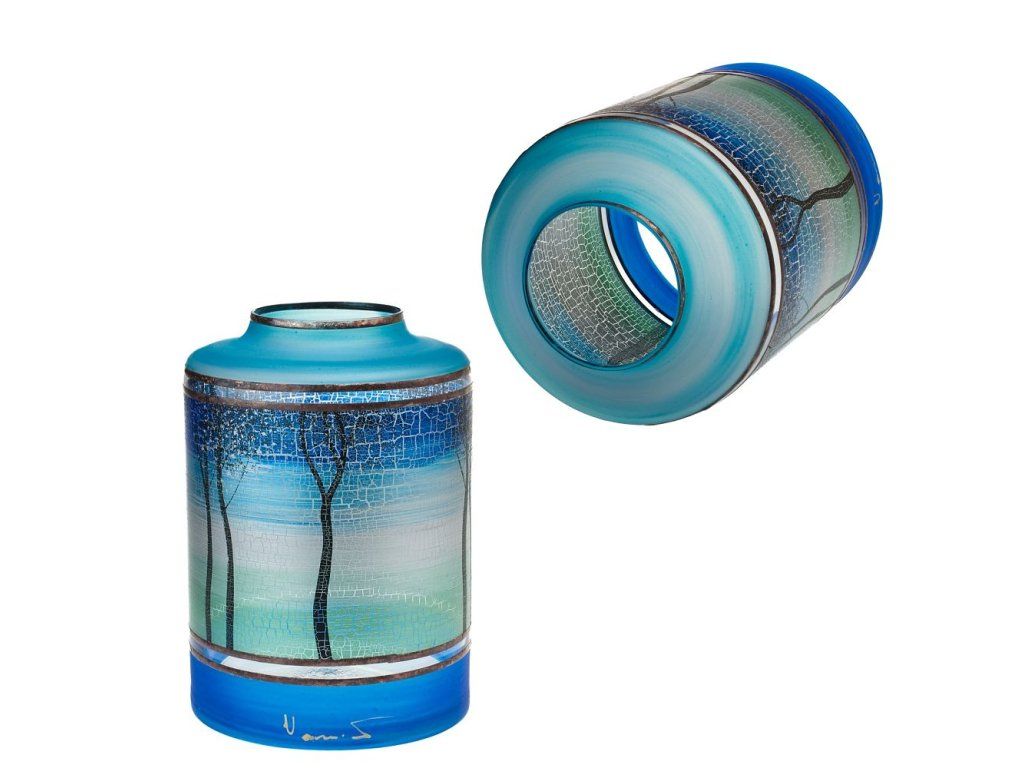 Ručně vyroběná váza, dekorovaná ve sklářském Studiu Miracle paní Vlasty Voborníkové, která se zabývá výhradně ručním dekorováním skleněných výrobků za použití patentované techniky dekorování - aplikace kovů v kombinaci s barevnými plochami. Výrobek je autorsky signován, opatřen certifikátem originality. Jedná se o dekorativní sklo. Nelze použít v myčce na nádobí.