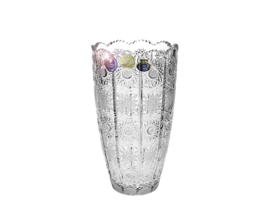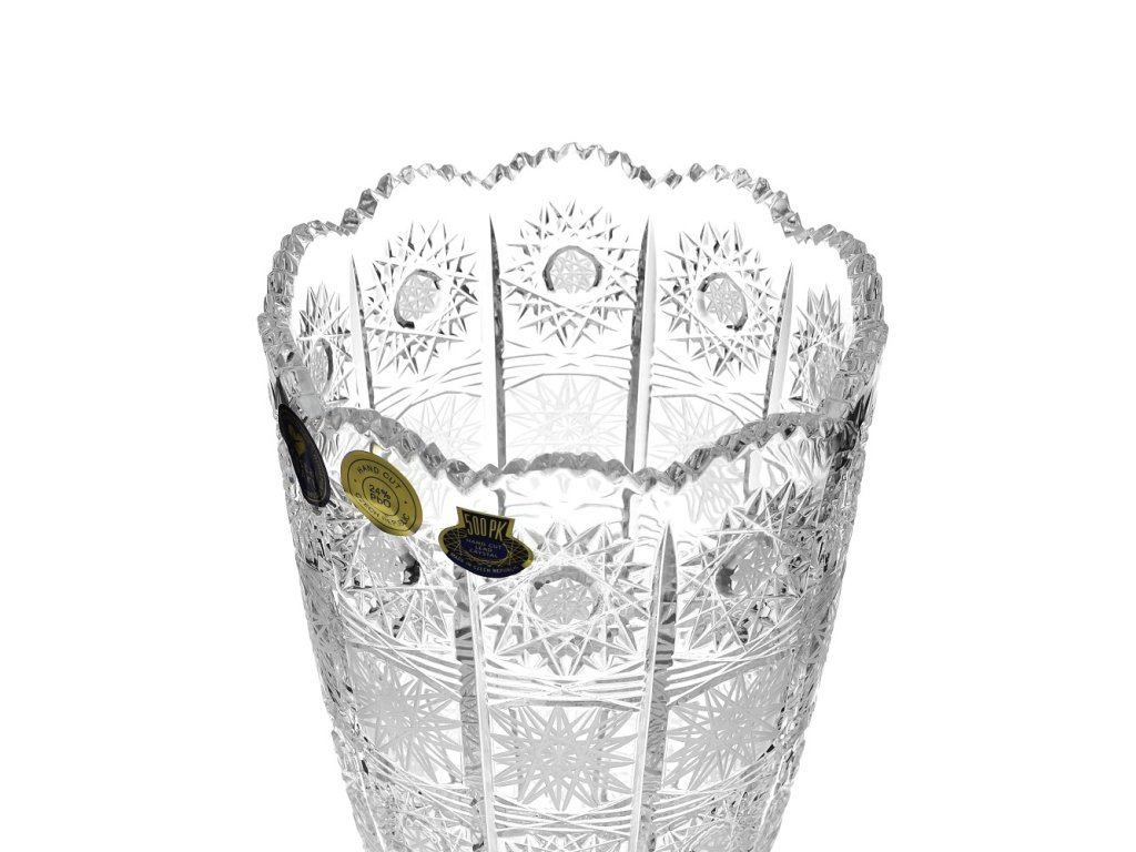 Váza - krásný kus bohatě ručně broušeného skla z českého křišťálu. vysoká umělecká hodnota tradiční řemeslo reprezentativní český dárek O vzniku typu brusu 500 PK: V roce 1929 vznikl patrně nejslavnější a komerčně nejúspěšnější typ brusu českého broušeného skla, užívaného později zejména při zdobení olovnatého křišťálu, a to vzor 500 PK. Jeho autorem byl brusič a podnikatel Ladislav Prostředník z Dobrušky (zkratka PK v typu dekoru jsou jeho iniciály).