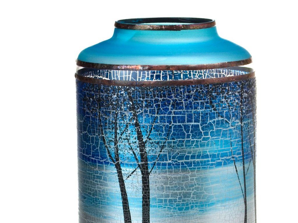 Ručně vyroběná váza, dekorovaná ve sklářském Studiu Miracle paní Vlasty Voborníkové, která se zabývá výhradně ručním dekorováním skleněných výrobků za použití patentované techniky dekorování - aplikace kovů v kombinaci s barevnými plochami. Výrobek je autorsky signován, opatřen certifikátem originality. Jedná se o dekorativní sklo. Nelze použít v myčce na nádobí.