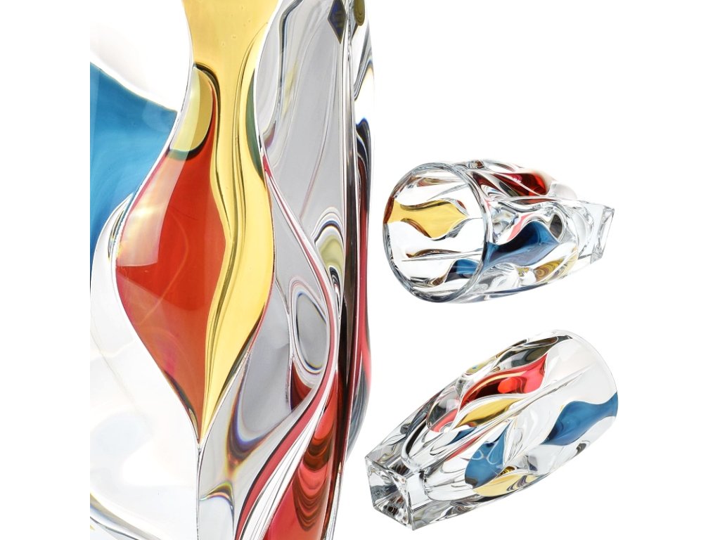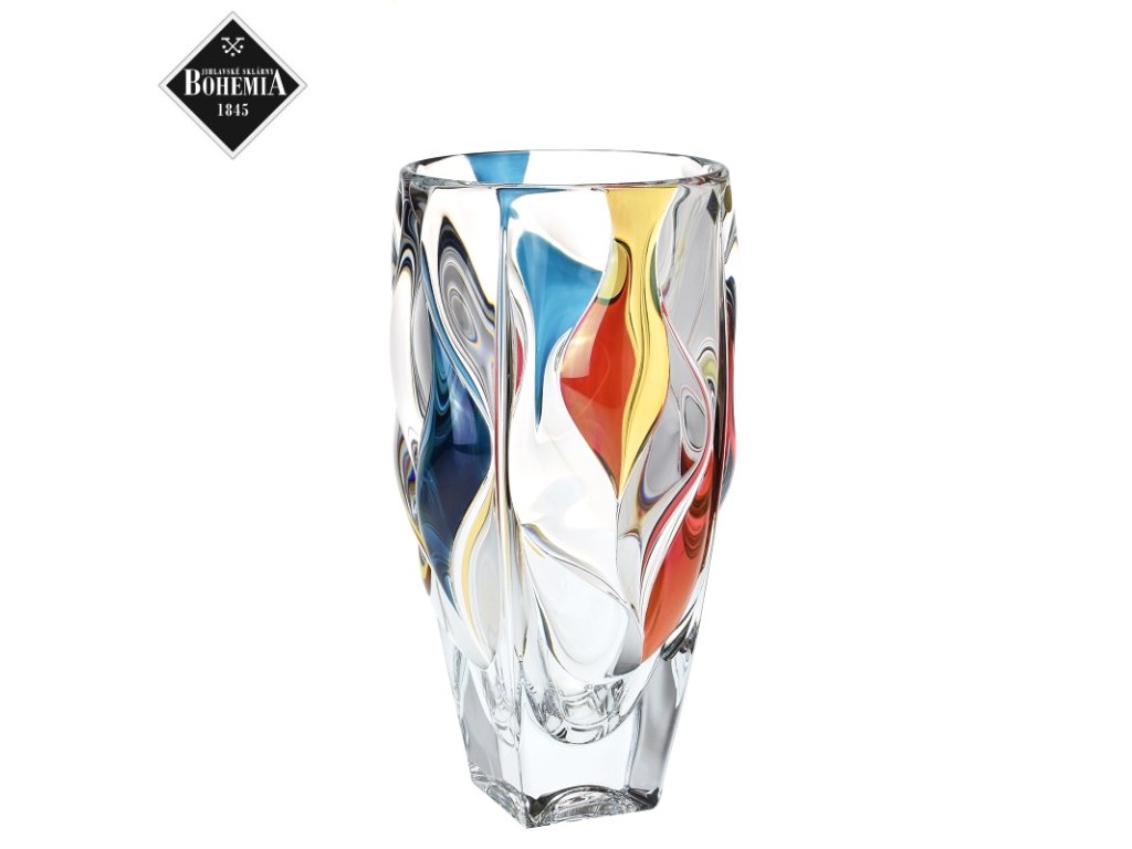 Kus krásného českého křišťálu - 30 cm vysoká těžká váza v moderní dekoraci barevnými listry. Bohemia Jihlava a.s. – český sklářský brand s historií Značka Bohemia Jihlava a.s. je odrazem bohaté tradice českého sklářského řemesla, jejíž kořeny sahají až do roku 1845. Přestože se dnes výrobky již nevyrábějí přímo v Jihlavě, značka si zachovává prestiž a kvalitu, kterou si po desetiletí budovala po celém světě. Co nabízí značka Bohemia Jihlava: Skleněné výrobky s nadčasovým designem, inspirované tradičním českým uměním. Záruku kvality – prvotřídní sklovina s vysokou brilancí a čirostí Eleganci pro každou příležitost – od slavnostních skleniček po dekorativní vázy a mísy. Dědictví, které žije dál Ačkoliv se výroba přesunula, duch značky Bohemia Jihlava přetrvává v každém produktu. Je symbolem elegance, řemeslné zručnosti a tradice, která si našla místo ve světových domácnostech.