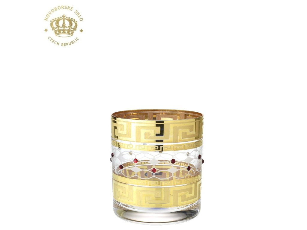 Luxusní bohatě ručně dekorovaná souprava 2 sklenic na whisky. Tradiční dekorace brusem, malbou zlatem a osázením červemými jabloneckými křišťálky. Nelze použít v myčce na nádobí a ani mikrovlnné troubě.