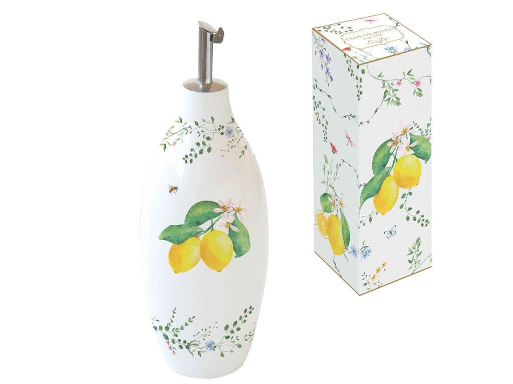 Porcelánová karafa na olivový olej s kovovou výlevkou se zátkou z kolekce Fleurs et citrons italské značky Easy Life® Perfektní dárkové balení ve stylu designu výrobku. Vhodné do myčky na nádobí i mikrovlnné trouby.