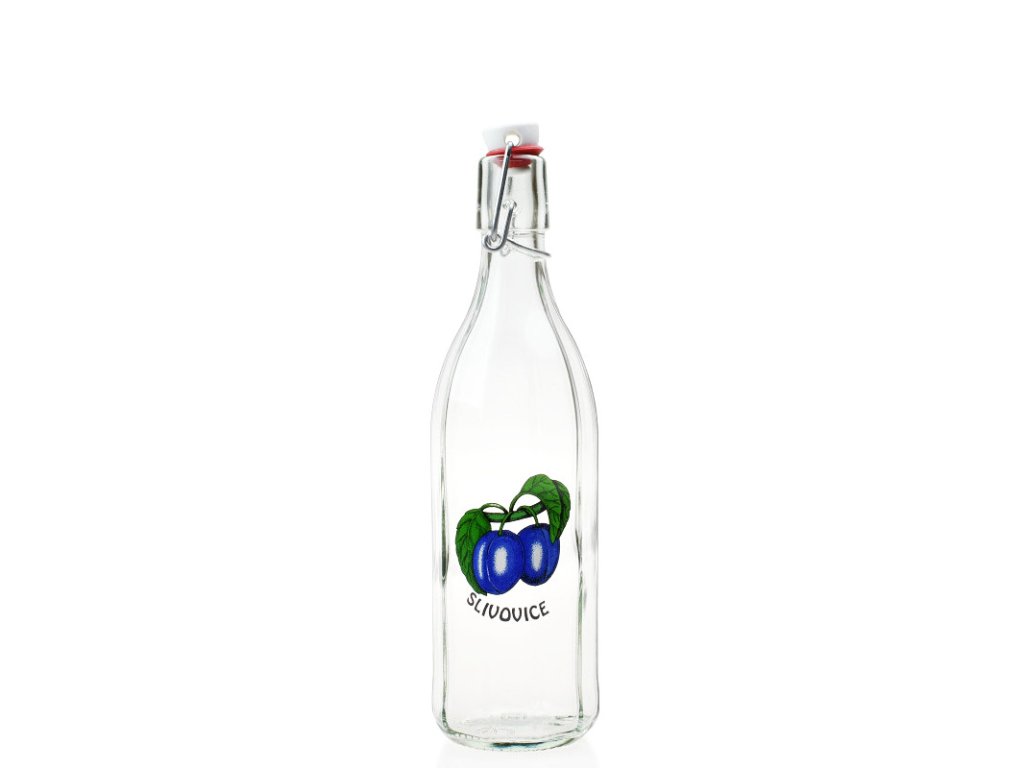 Praktická půllitrová láhev na slivovici s patentním uzávěrem a potiskem.
