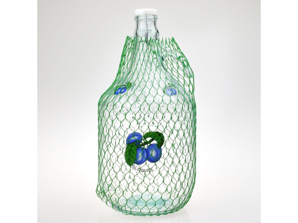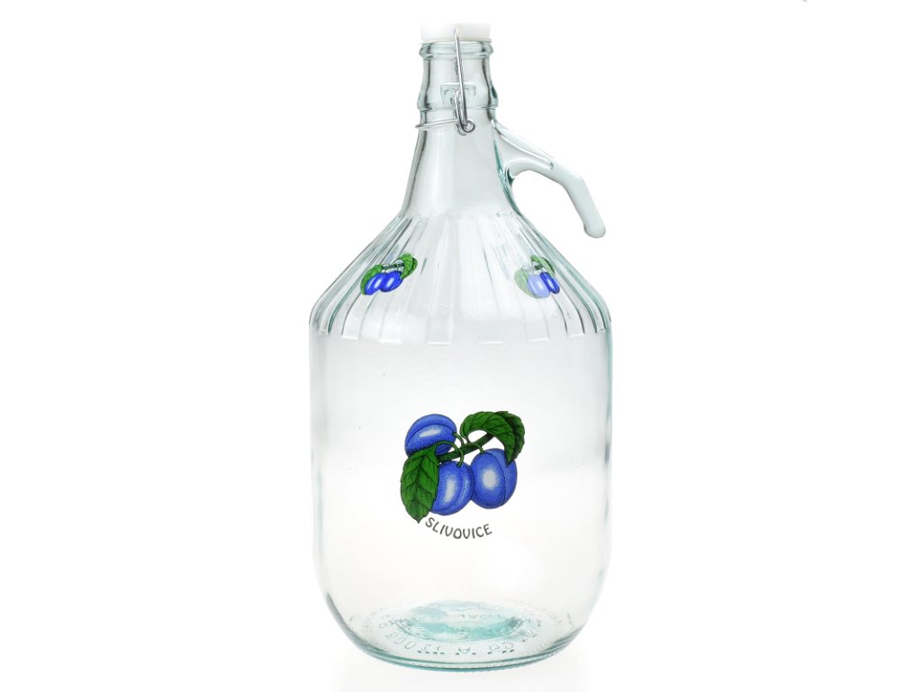 Velký pětilitrový demižon na slivovici s dekorem švestek.