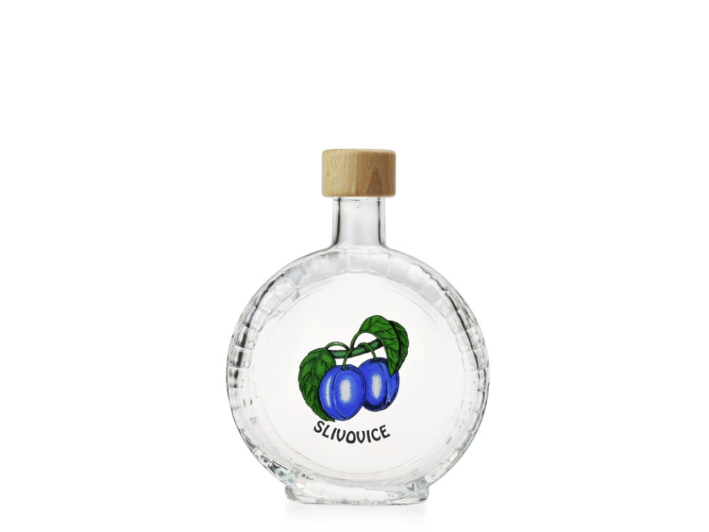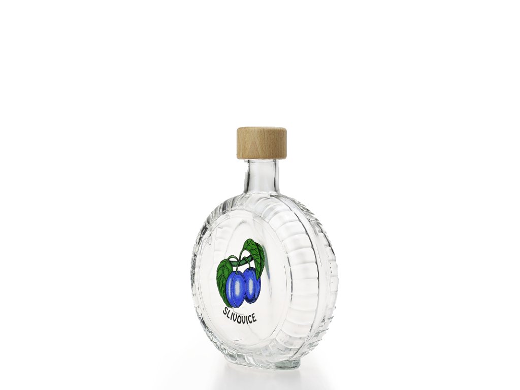 Kulatá a placatá - skvěle tvarovaná láhev se dřevěným šroubovacím uzávěrem s plastovám závitem na slivovici.