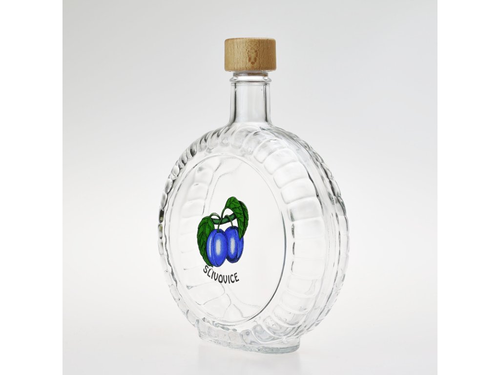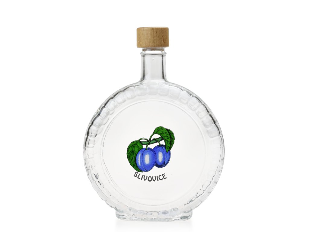 Kulatá a placatá - skvěle tvarovaná láhev se dřevěným šroubovacím uzávěrem s plastovám závitem na slivovici.