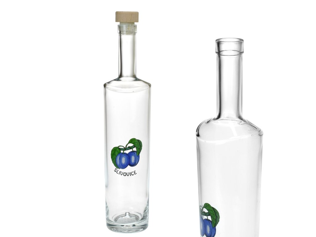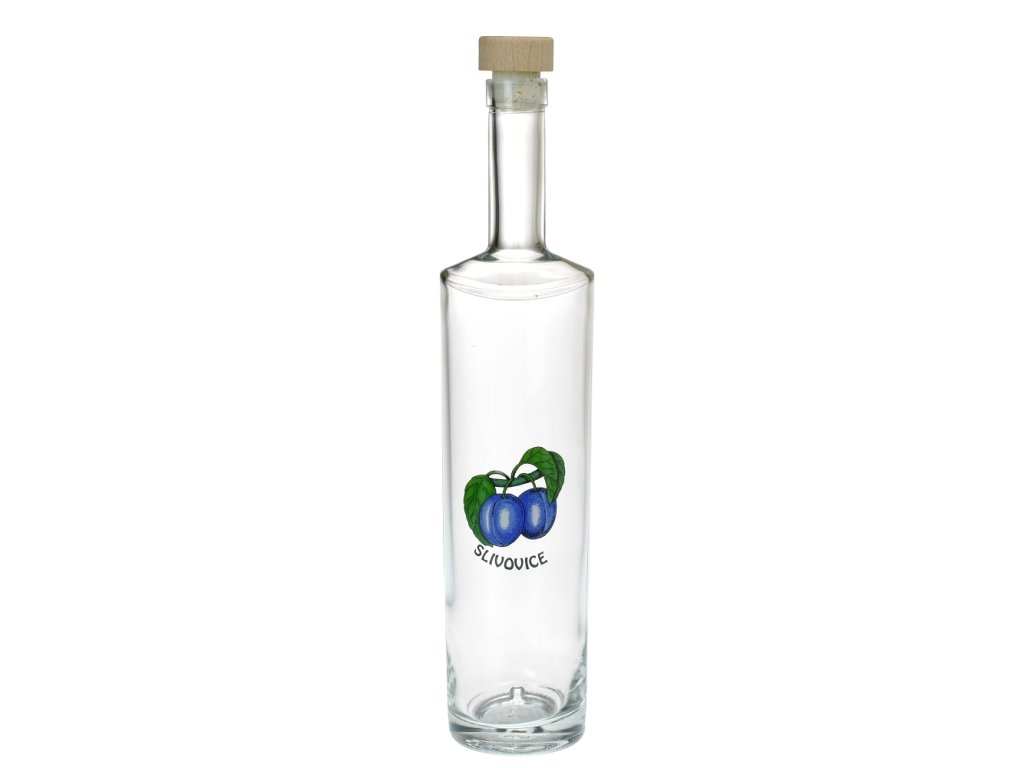 Vysoká elegantní láhev na slivovici s korkovou zátkou se dřevěným úchytem. Darujte pálenku stylově !