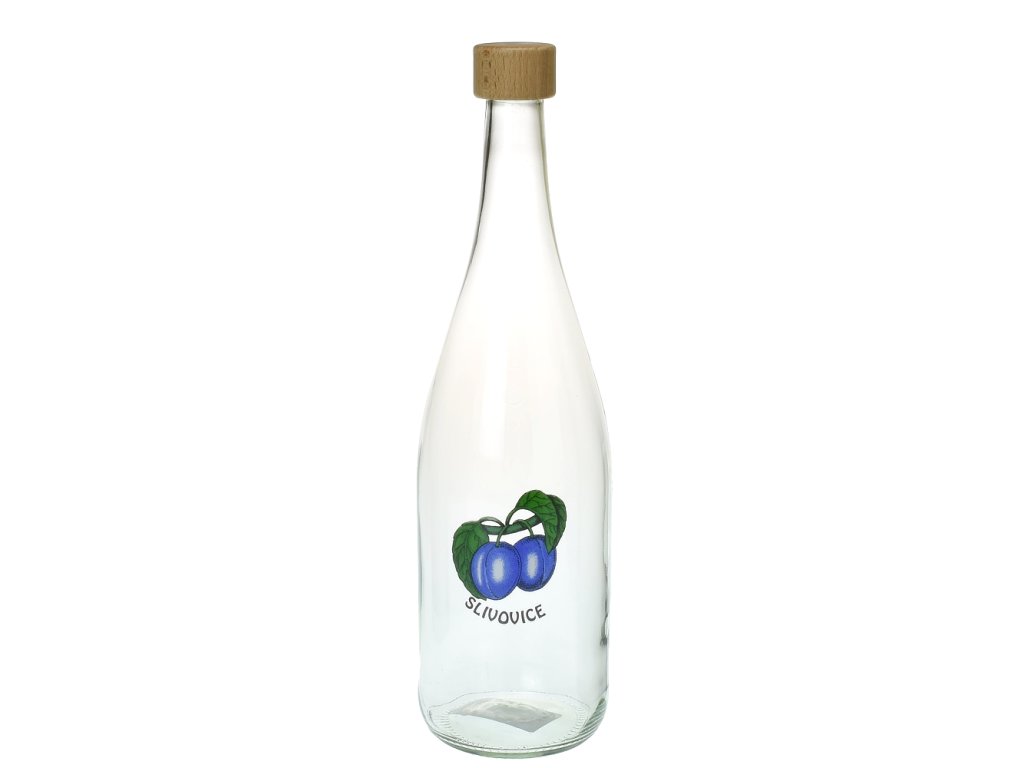 Praktická litrová láhev klasického tvaru na slivovici s patentním dřevěným uzávěrem uvnitř s plastovým závitem a těsněním.