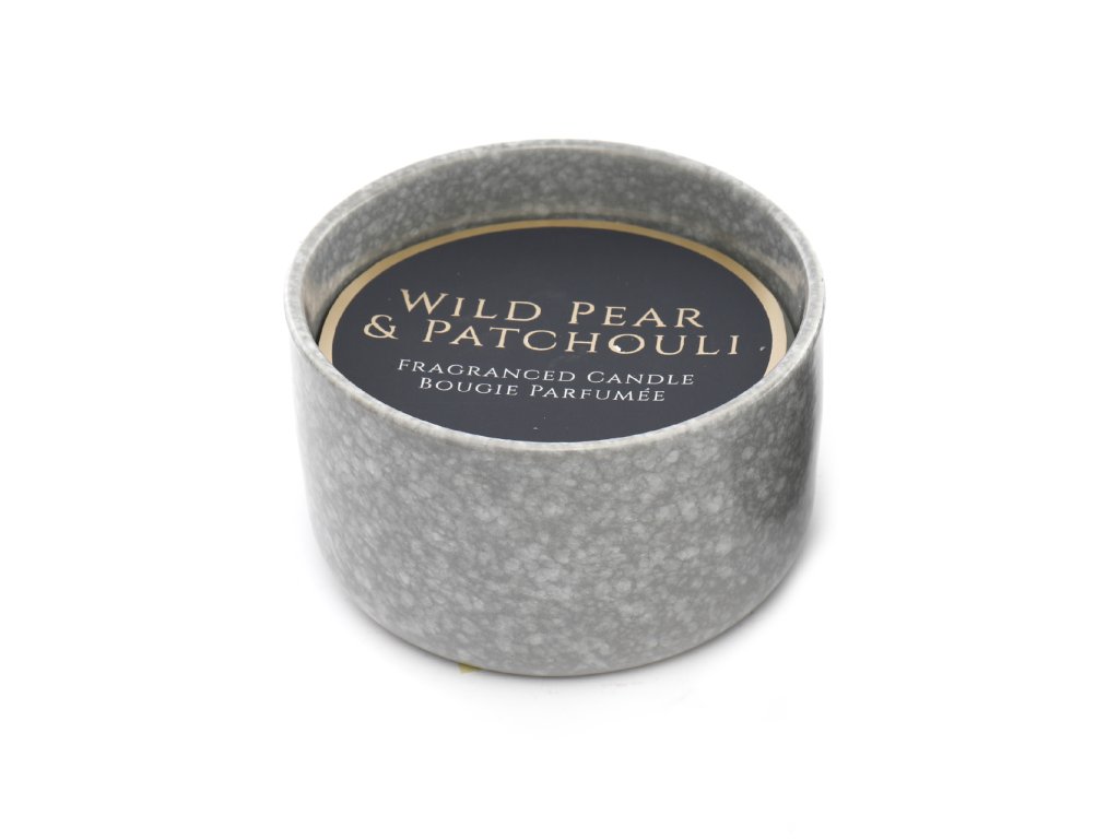 Svíčka v keramickém obalu Světle šedá s vůní Hrušky a Pačuli. Vneste do svého domova teplo a kouzlo s touto nezbytnoudesignovou dekorací, kterou lze po vyhoření svíčky použít jako nádobu na další votivní svíčky s příjemnou vůní.