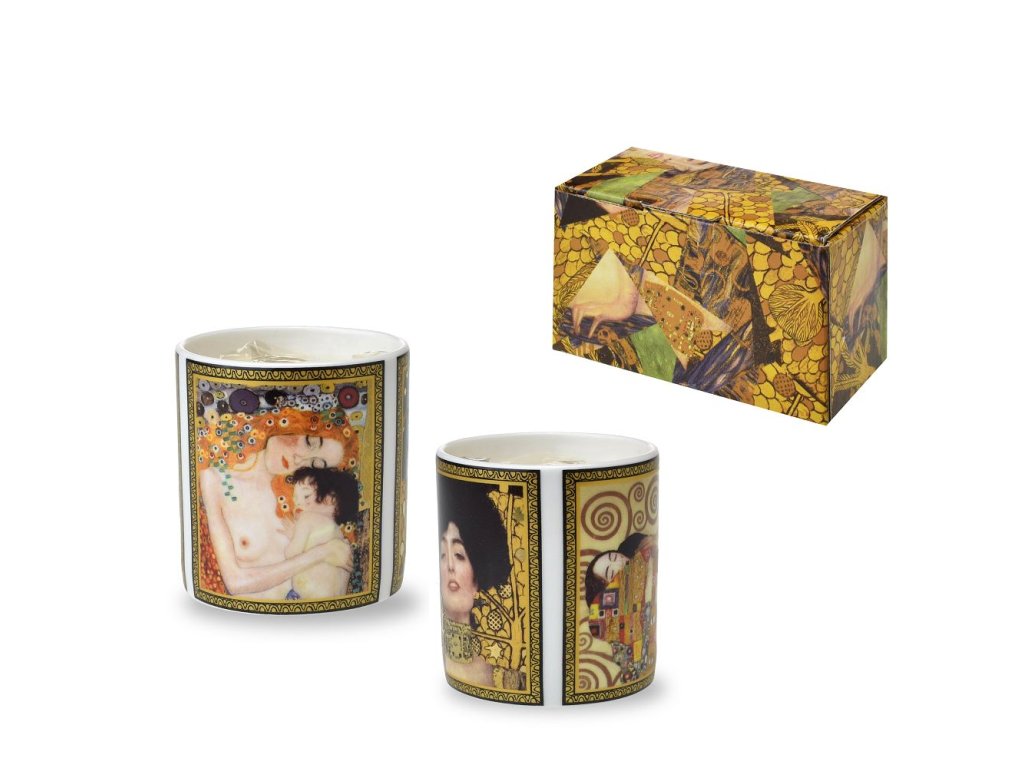 Dárkově balená souprava dvou svíček v porcelánovém svícnu s dekorací na motivy slavných obrazů Gustava Klimta.