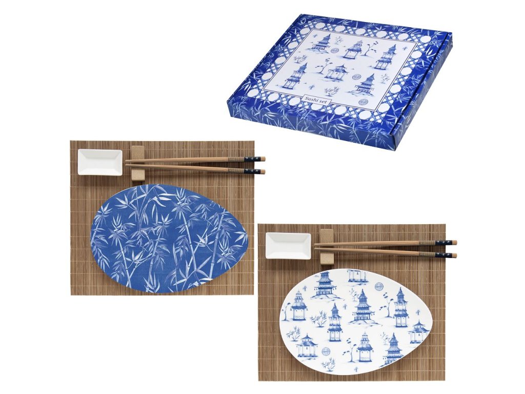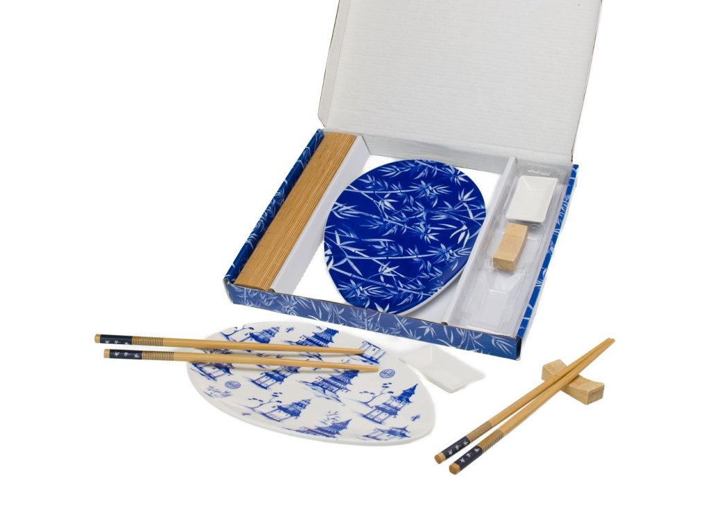 Osmidílná souprava na sushi z kolekce Pagoda italské značky Easy Life®. Perfektní dárkové balení ve stylu designu výrobku. Souprava obsahuje: 2 x porcelánový talíř 2 x pár bambusových hůlek 2 x podložka pod hůlky 2 x bambusové prostírání Porcelánvé talíře jsou vhodné do myčky na nádobí i mikrovlnné trouby.