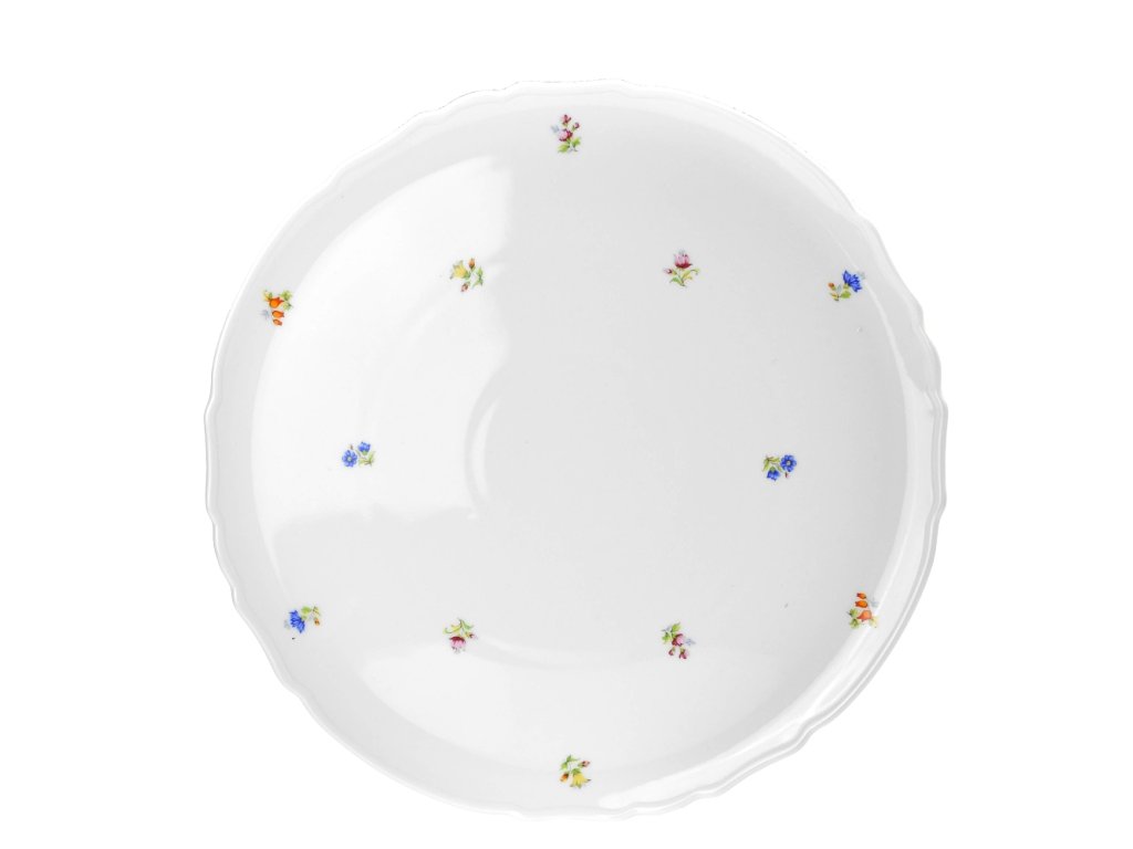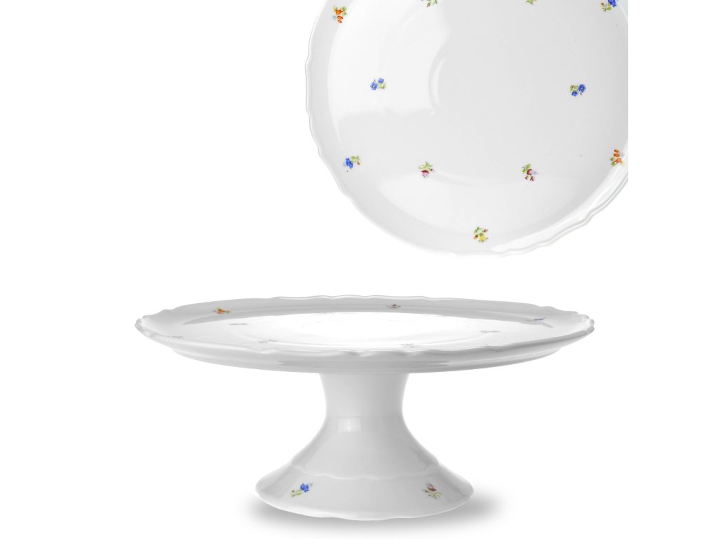 Velký porcelánový talíř na dort na noze. Drobné poházené kytičky (proto házenka) na klasickém tvaru karlovarského porcelánu Ophelia. Dekorace č.26909A0 (dříve 134/0) Lze použít v mikrovlnné troubě i myčce na nádobí.