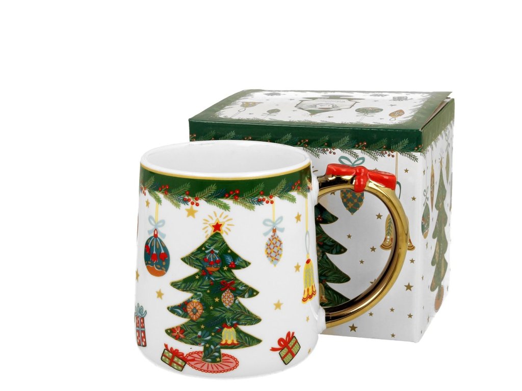Hrnek AROUND CHRISTMAS TREE s mašlí na zlatém uchu, součást vánoční kolekce, se vyznačuje přírodní krémově bílou barvou s jemným leskem a mimořádnou pevností a odolností při zachování lehkosti a propracovanosti. Nelze použít v myčce na nádobí a ani v mikrovlnné troubě.