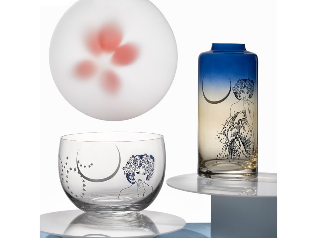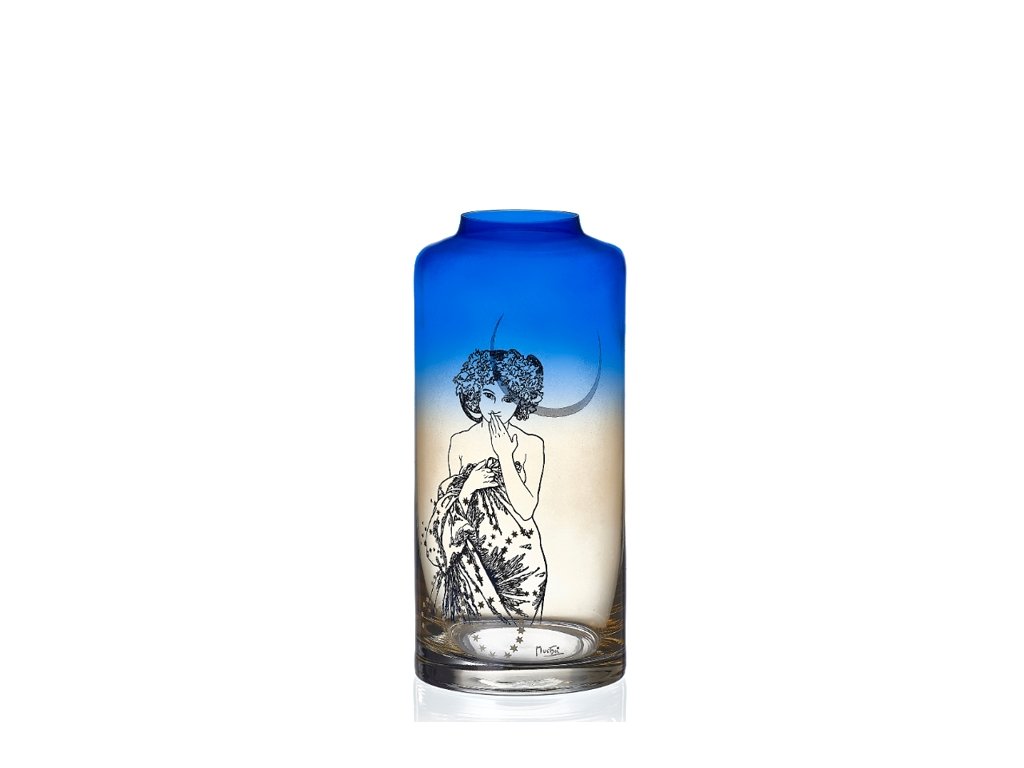 Designová váza z exkluzivní edice zvaná Moon harmonickou cestou interpretuje slavné umělecké dílo Alfonse Muchy. Její kouzlo spočívá v motivu zasněné ženy obklopené hvězdami, za jejímiž zády vychází měsíc. Vše elegantně završuje stříkaný kombinovaný motiv žluté a modré barvy, který připomíná přechod mezi dnem a nocí plnou snů. Nelze mýt v myčce na nádobí.