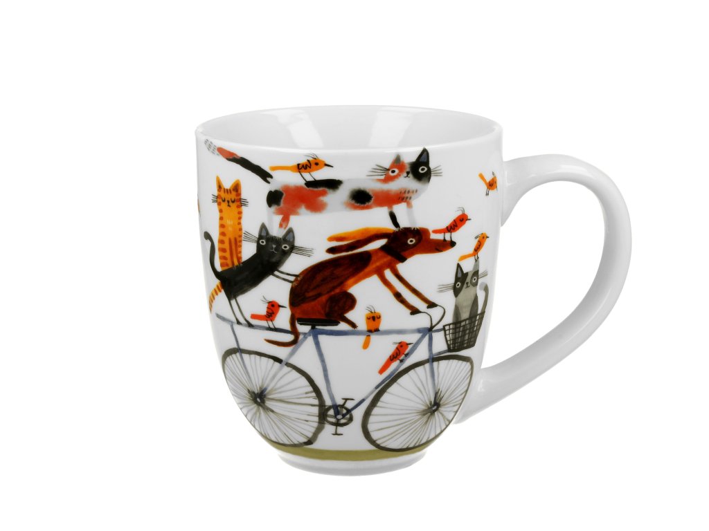 Velký porcelánový hrnek XXL Pes, kočky a ptáčci na kole Vás potěší nejen při popíjení oblíbeného nápoje, ale také svým jedinečným dekorem, který díky svému objemu náležitě vynikne.